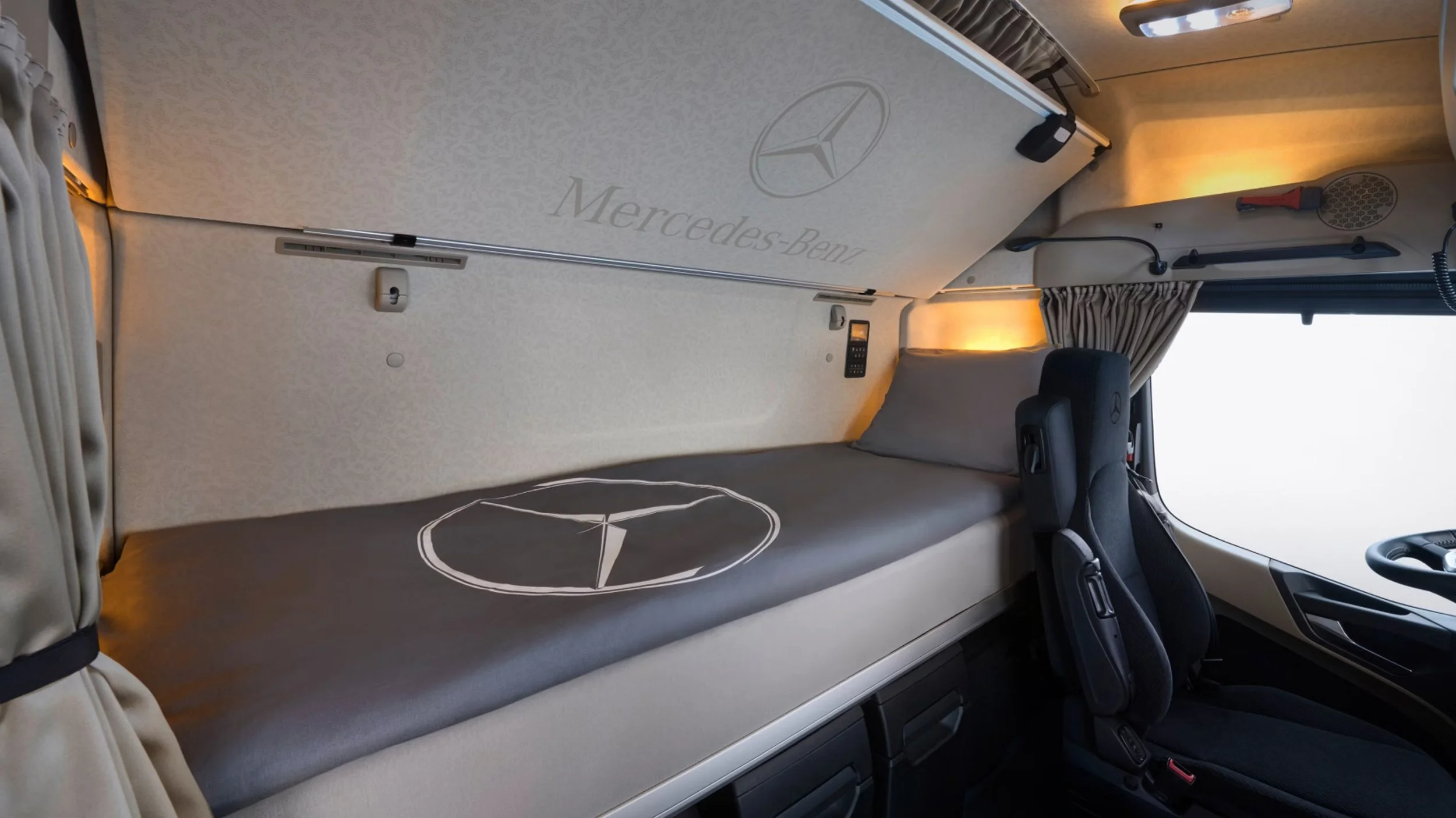 Łóżko w nowym Actrosie L ma szerokość 750 mm, długość do 2200 mm i jest wyposażone w pełny stelaż – standardowo z jednoczęściowym 7-strefowym materacem z zimnej pianki o grubości 110 mm. Na wierzchu znajduje się nakładka na materac o grubości 45 mm.